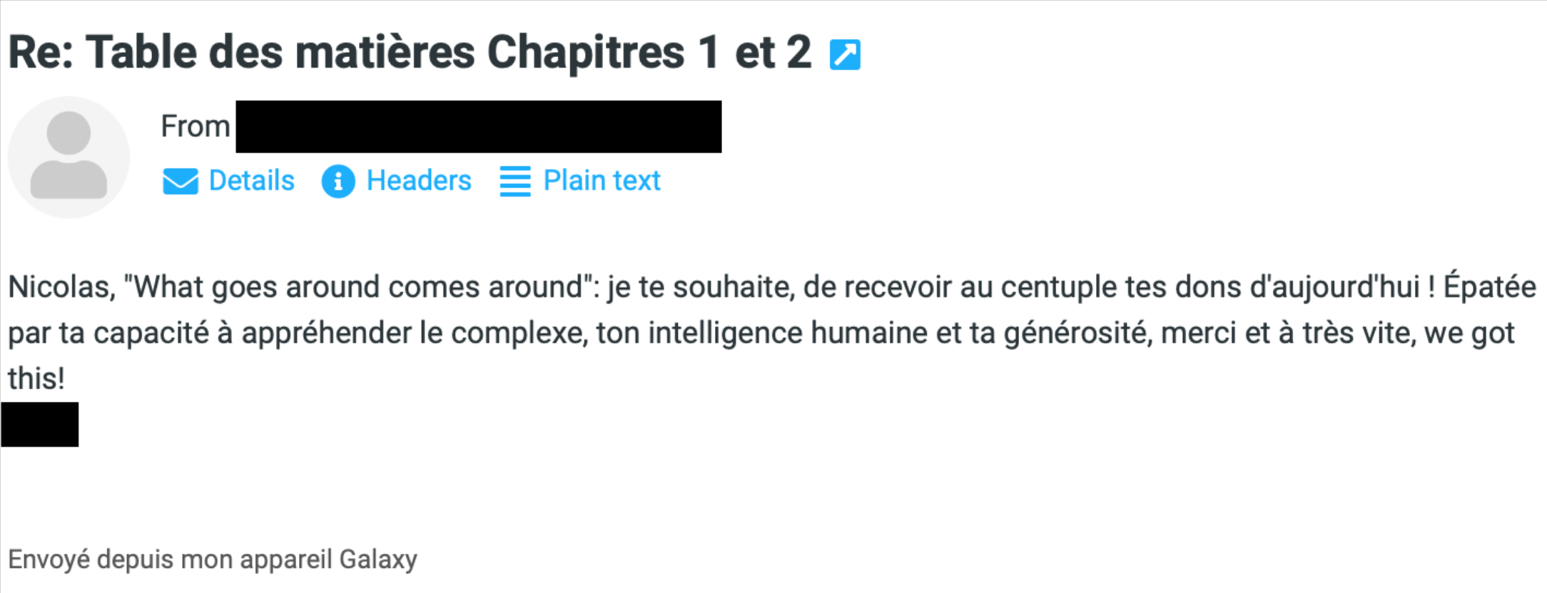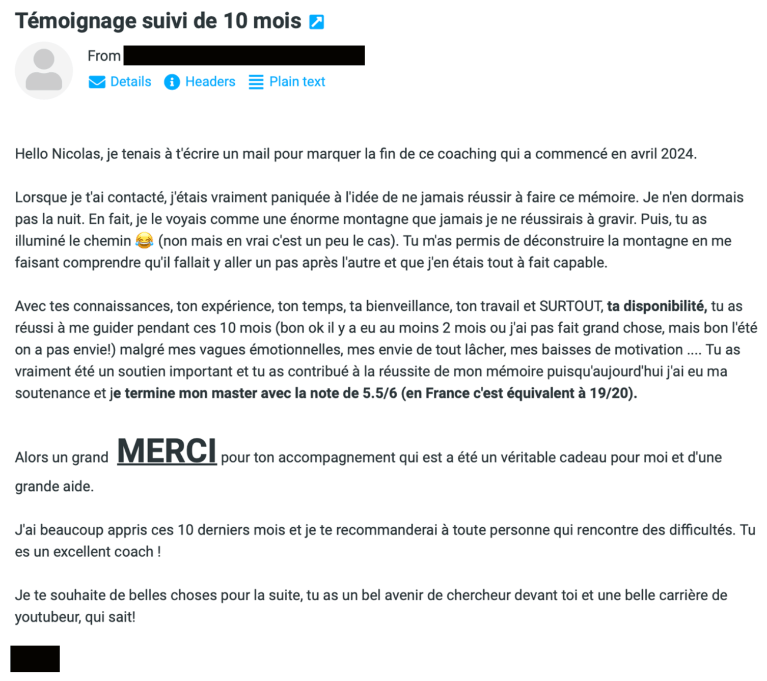 L’enregistrement complet de la séance pour vous réécouter à froid. Une liste des questions susceptibles d’être posées le jour J. Et 14 jours de suivi mail – parce que les doutes reviennent toujours dans les derniers jours avant la soutenance.